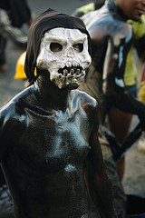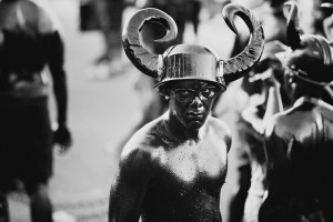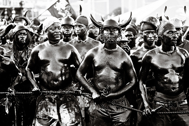 Though originally characters of European tradition, the more modern rendition of these varied Jab have their roots in slavery, as freedmen and freedwomen came to take over Carnival celebrations with the onset of emancipation. The lanse kod character of Haiti (pictured below) for instance attempts to blacken his body as much as possible, to become “as black as slaves.” In Trinidad and Grenada, the black-skinned Jab Molassie and Jab Jab of early Carnival similarly symbolized both the brutal system of slavery and the freedom that came after.