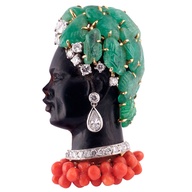 By the 20th century, black-a-moor imagery became a popular form of fashion accessory among many looking to invoke a romantic notion of “Old Europe.” Antique houses, both large and small, have long collected such items and present them for sale as part of vintage-art. One only has to do an online search on “black-a-moor jewelry or art or accessories” to find numerous sites where they can still be purchased. And much of it doesn’t come cheap. On sites like Etsy, a pair of vintage 1940s black-a-moor curtained lamps goes for $2,200 USD. Cartier offers numerous black-a-moor brooches inlaid with diamonds and gems from the 1950s and 1960s starting at around $6,000 and up to $10,000 to 20,000 USD. According to Forbes, in 2007, the Skinner auction house sold a pair of life-size black-a-moor musician automata by the famed French mechanical-artist Jean Roullet for $501,000 USD.