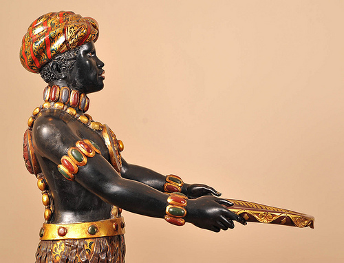 This emphasis of black skin with bondage easily merged with depictions of black-a-moors in places like Venice. Rather than threatening or associated with divinity, they become increasingly one-dimensional as servile. In decorative sculpture they are depicted holding trays, in the shape of candle holders or as the foundation of stands and tables. The Baroque Venetian sculptor Andrea Brustolon (1662–1732) was one of the most important creators of this black-a-moor servile artwork. For the common classes, black-a-moor furniture and depictions came to serve as a symbol of aspirational wealth; one might not be able to own one’s own black servant, but one could own something fashioned in that likeness–be it a table, candle-holder or statue. Thus even with the demise of slavery, black-a-moor servant imagery had become popularized throughout various parts of Western Europe among both the wealthy and common classes.