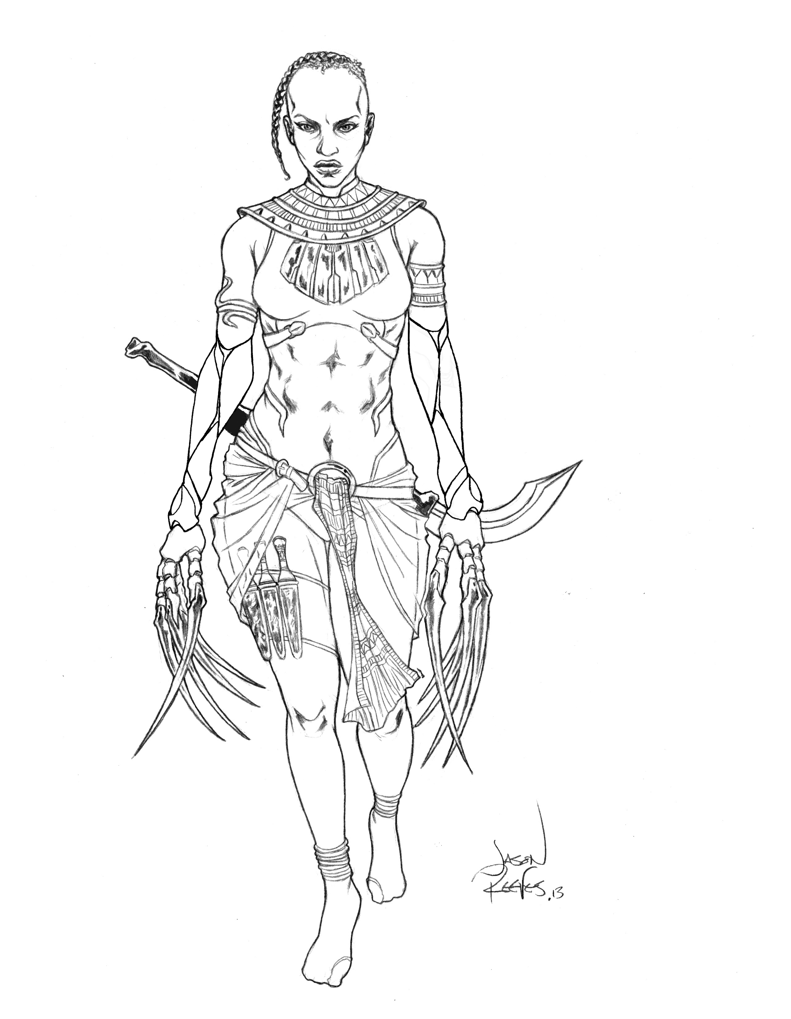 The image above is a character from my first serious foray into writing, many, many moons ago–a Daughter of Sekhmet, a member of an order of women warriors, founded by a priestess during the time of the Mad King, who pledge their lives to a goddess of war and live by a rigid code of honor–like nuns with swords and retractable steel claws. They were one facet of this larger fantasy world I was building, a tale based greatly on the cultures and myths of ancient Egypt, Nubia and other nearby regions, but from a decidedly “unique” perspective, featuring a diverse cast, magic and retro-futurism, demons and gods, and the quest for some magical amulets. Sure would have made a lot more sense than Jaime Lannister playing the god Ra.
