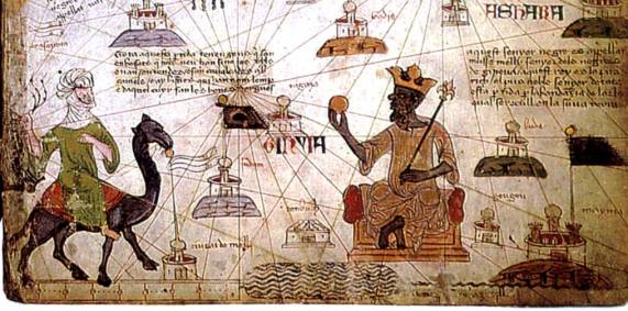 mansa musaiWhen the Portuguese set out to find Prester John and a route to the East as part of spiritual salvation, this gold was close in mind. The Portuguese had long plowed the sea trade from the Mediterranean to western Europe, in alliance with Genoese merchants. Gold however, was siphoned to them in meager amounts through their Italian partners. After Prince Henry captured a large stash of West African gold from Arab-Berber Muslims in North Africa, the Portuguese became convinced that the source was a river of gold, the Rio de Oro, which flowed somewhere in West Africa. Mansa Musa I on the Catalan Atlas, holding aloft his immense gold nugget, was evidence enough to make them certain.