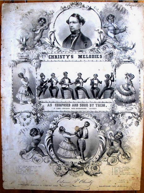 1844 sheet music cover for a collection of songs by Christy’s Minstrels, featuring the troupe’s founder George Chrsty up top.