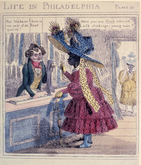 A quaint cartoon, drawn and etched by E. W. Clay. Philadelphia: Published by Wm. Simpson, 1828. Caption: “Have you any flesh coloured silk stockings, young man? Oui Madame! here is von pair of de first qualite!” Courtesy of the Library Company of Philadelphia. [caption source)