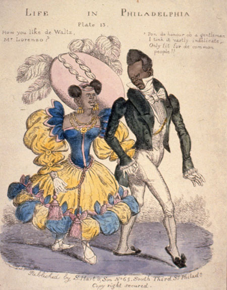 A quaint cartoon, drawn and etched by E. W. Clay. Philadelphia: Published by S. Hart & Son, 1829. Caption: “How you like de Waltz, Mr. Lorenzo? ‘Pon de honour ob a gentleman, I tink it vastly indelicate. Only fit for de common people!!” Courtesy of the Library Company of Philadelphia. [caption source)