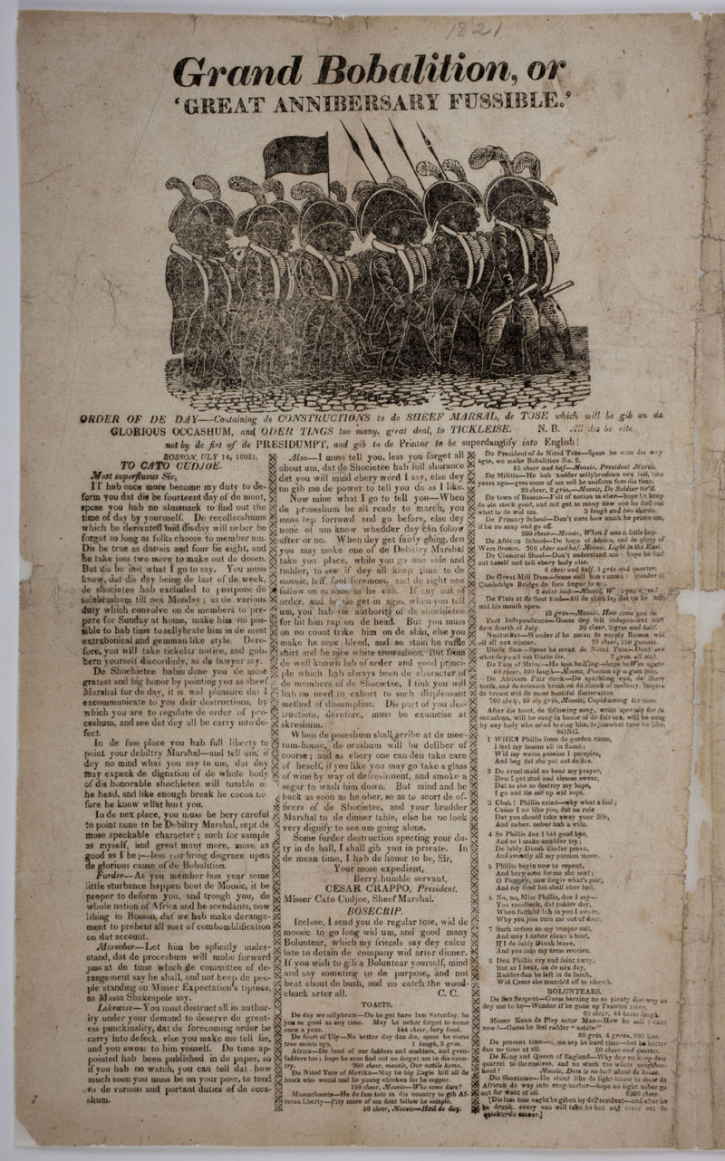 Bobalition Broadside early 1800s, mocking an abolition parade by the African Society of Boston.