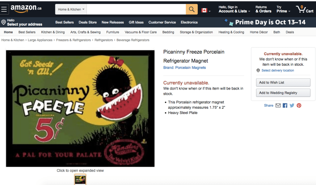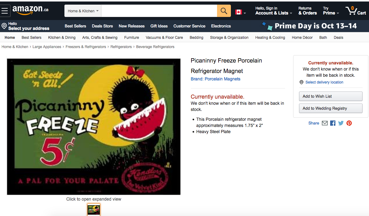 The Picaninny caricature was ubiquitous in racist imagery: unkempt Black children, hair in kinky knots or plaits sticking straight up, and prone to mischief. Often they were the butt of jokes or used to sell items. Sometimes they were contrasted to white children, as if highlighting the difference in color would uplift the latter’s innocence. At other times the Picaninny was so divorced from their humanity, they served as possible bait or food for alligators and predators: just another animal to be eaten. In Ten Little Niggers, a minstrel song popularized in the 1860s, most of the Black children each fall prey to some form of macabre death: choking, chopped with an axe, swallowed by a fish, hanging, even being “frizzled” to nothingness by sitting in the sun. This song of young Black children as merely disposable, often interchangeable with the similarly disturbing Ten Little Indians, was repeatedly adapted to other forms including children’s literature. In 1939, Agatha Christie named a mystery novel of murder after the ditty, though the alternative title And Then There Were None is most known in the United States. It even become a movie. The Picaninny Freeze advertisement featured below, can still be found on Amazon in Canada–though it’s currently unavailable. Maybe it sold out.