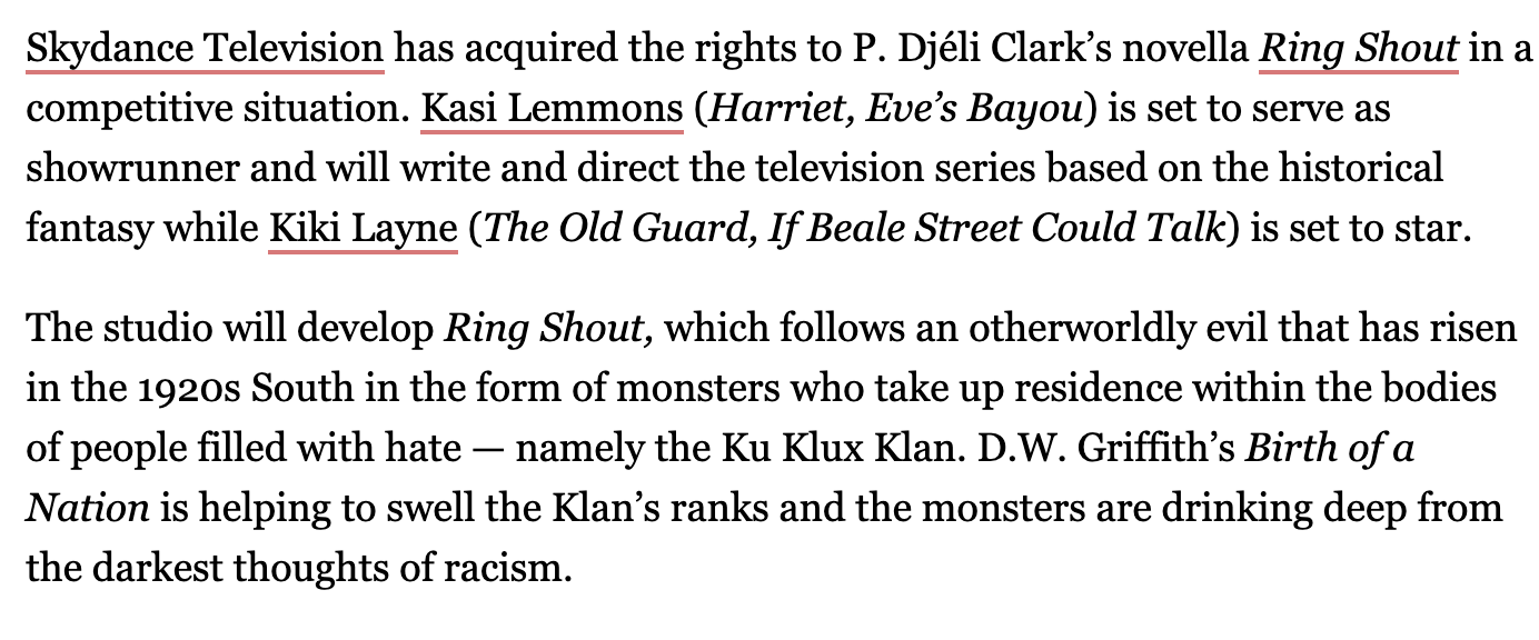 I wrote about how Ring Shout came to be a few months back. As I said then, this was a story that was rumbling about in my head for a few years. I wasn’t sure it would ever actually be written. And I pitched it on a whim–something to take up some space before my full length novel comes out in May 2021. I thought it’d be a curious novella that might catch a bit of attention. Mostly I was just happy to get it out of my thoughts, down on the page, and out into the imaginations of readers. But this? This world of options and possible adaptations and me sitting on the phone talking to producers, chopping it up with directors like Kasi Lemmons (I still remember going on a date in college to see Eve’s Bayou) and zoom chatting with Kiki Layne while trying (and failing) not to look starstruck–didn’t expect none of this. At. All. I’m extremely grateful, and humbled by it. But it’s also still very surreal. Like watching it play out with someone else. Yet here we are. Can’t wait to see what’s next!