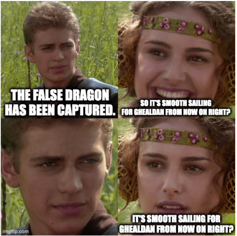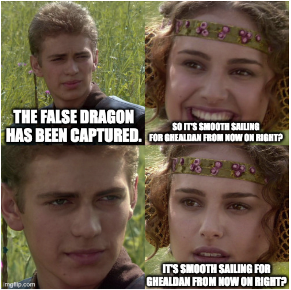 But we all know this False Dragon will be captured. And it’s smooth sailing for Ghealdan from then on in the books… yup. Smooth sailing…