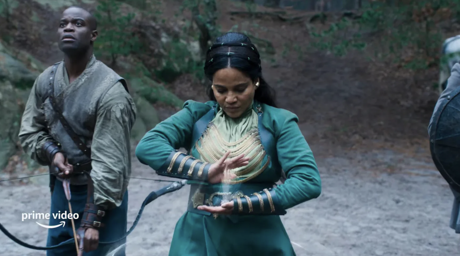 From there we end up back with Nynaeve (Zoë Robins), who finds herself in a thicket of Aes Sedai–and their warders. She hangs back though, exchanging a look with Lan (Daniel Henney). Moraine meanwhile is getting some needed healing from another Aes Sedai, Kerene Nagashi (Clare Perkins) of the Green Ajah. In the books, Kerene is one of the few Aes Sedai (along with Moraine) who knows about the Dragon being reborn and is sent out to find him. There’s nothing in this episode that hints she’s aware of that, so the show has appeared to repurpose her role. The healing has taken the wind out of Kerene, and Moraine notes surprise at this–given how strong she is in the power.
