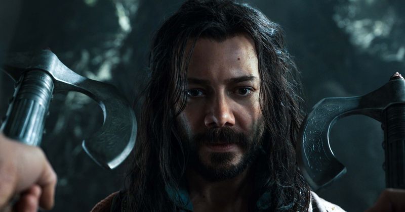 Two soldiers are trying to get their battered king, the ruler of Ghealdan, to safety. Their pursuer is a lone figure in dark robes, striding casually through the mayhem. Nope, not a vampire. That there is the one and only “he of the long dark and luscious hair,” Logain Ablar (Alvaro Morte)–the False Dragon, one of the most powerful male channelers of the age. And he is burdened with glorious purpose.