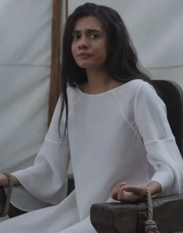 The first scenes feature Moraine (Rosamund Pike) and Lan (Daniel Henny) approaching Tar Valon, where we get glimpses of the White Tower in the distance. They’re part of the Aes Sedai entourage bearing a captured Logain for trial–though against protocols, he’s already been gentled. The Reds are there as well, including Liandrin (Kate Fleetwood) along with the Greens like Alanna (Priyanka Bose). At their head is a sober Stepin, leading Kerene’s horse and boots.
