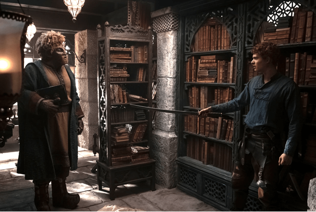 I’ve been waiting to see Loial since the series started. And I was as overjoyed as probably everyone else who was waiting to see him so early, by episode 5. So what did I think? This Loial has that rumbling voice and there was no doubt when I first saw him that this was an Ogier. However, I have to admit that between the excitement I was a bit disappointed. I was hoping for…more…from an Ogier. In the books, they are massive–tall enough to brush the ceiling. This Ogier looked more like a really big guy. Like he shops at the Big and Tall store. Also, unlike the Ogier from the books, there were no tufted ears that twitched or long drooping eyebrows. Turns out, they have a good reason for not going all out on Loial–money. In an interview, showrunner Rafe Judkins made plain that they just couldn’t afford to spend all their SFX on some CGI Loial. And that’s absolutely understandable. The actor playing Loial (Hammed Animashaun) does a fabulous job conveying the character (though I hope the more childish whimsy and innocence Loial gives off in the books appears later) and the makeup artists should be commended! So, disappointed. But appreciative for what the show did with the budget they had. For those of you still griping, as my mother might have said, “You got CGI Loial money?” Okay then. Let it rest.