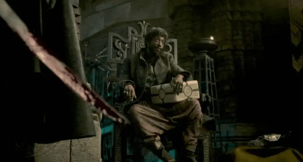 Fain goes on to say he’s been coming to the Two Rivers every Bel Tine because he’s a Darkfriend, not for the tabac. Yeah, cat’s out the bag on that one bruh. Says he’s been sent there by the Dark Lord, to a small backwater village that surprisingly has five ta’veren. Glad somebody’s bothered to use that word again. Kinda a big deal. As he talks, we see other scenes: Rand looking at where Ishmael had once stood. Egwene sobbing as Nyaneve lies over her. That’s why we sent the Trollocs to kill all of you, Padan Fain says. By the way, bruh, are you just lounging up on Agelmar’s throne? Oh, the disrespect! He tells Perrin that all of this was actually to draw the five of them to the Dark One. Because the world needs the Dark. The world needs balance. Some of you, he says, will turn to the Light. Others to the Shadow.