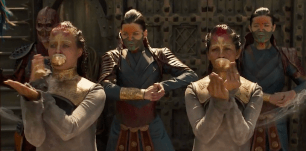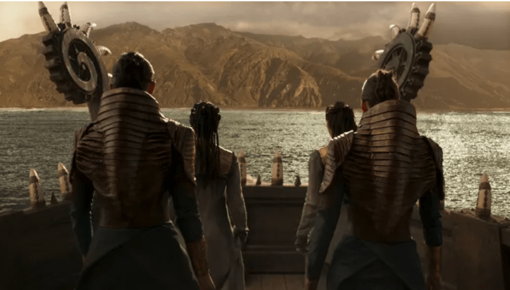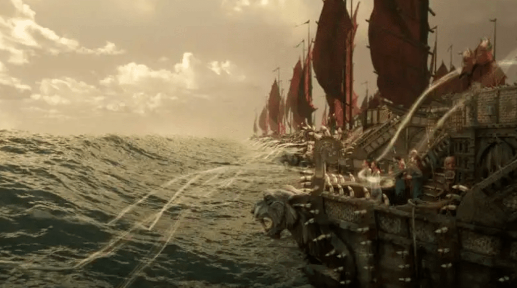 On one ship’s deck, two women in plain brown dresses with what look like golden muzzles on their mouths step forth. Behind them are two women in blue uniforms, their faces partially painted. The uniformed women begin speaking in an unknown language, as if giving an order. In response, the two muzzled women start moving their arms–creating weaves of the One Power. And the seas rise. A wall of water lifts up like a tsunami, towering before the tiny figure of the girl on the shore.