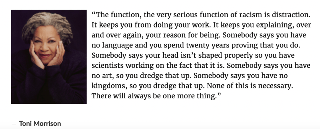 But wait, we shouldn’t friggin have to. You know how ridiculous it is at times to even be having these arguments and debates? Over the probable skin color of a hobbit? Or a fictional sea lord? Or a half-human, half-fish person? Do y’all even hear yourselves? These arguments are dumb. A waste of time. And they rob us of simply enjoying these imaginative worlds when we have to take up mental and physical breath to defend our right to exist within them. But maybe that’s the point, as Toni Morrison so astutely pointed out: