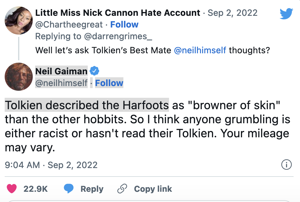 From the moment I saw a poster of a Black Dwarf lady for the new Amazon Prime series Rings of Power, I made the prediction that come late summer and into the early Fall, I’d be living off fanboy tears and lembas bread. Turns out, ain’t enough lembas bread at Costco to go with the fountain of white tears shed over Black dwarves, hobbits, mermaids and other fictional characters. It’s been a flood. And frankly, for some of you, I’m just plain embarrassed.