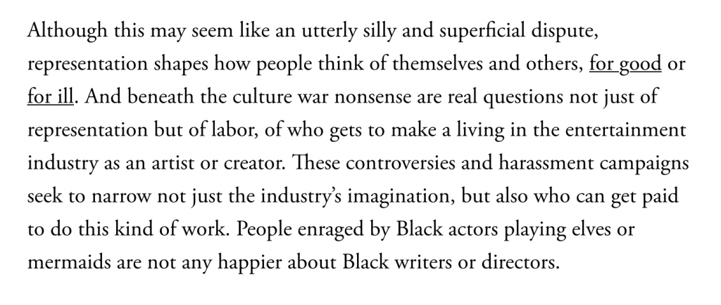 Look, I’m here in the trenches “creating our own.” I’m doing the thing. But I still want all the Black dwarves, hobbits, and mermaids appearing in the seminal works in genre too, where Black and Brown eyes can see themselves with wonder. It ain’t either or for me. I want BOTH. And if it ticks off racists, I definitely want it. Whatever they working at, I’m working against it. So keep on crying. Cuz we’re just getting started. Like I said up top, planned to live off lembas bread and fanboy tears this Fall—and I’m fresh outta lembas bread.