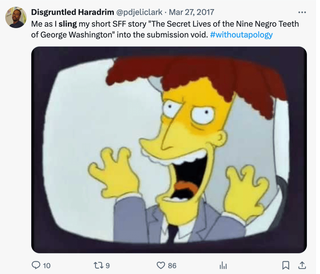 In 2018 my short fantasy story “The Secret Lives of the Nine Negro Teeth of George Washington” appeared in the February edition of Fireside Fiction magazine. And, to my surprise, it was a success! Something about the story connected with people. It got some small buzz, did some numbers, and (to my shock) got nominated for some prestigious awards. By the time the dust settled, it was holding a Locus, a Nebula, and even a wikipedia page.