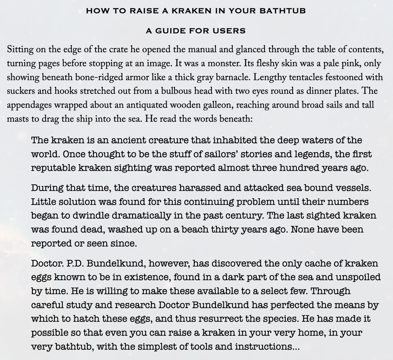 Here’s an excerpt of “How to Raise a Kraken in Your Bathtub.” Read more (if you so desire) at Uncanny Magazine. And be sure to pick up a full copy of Issue 50 to support this important ezine to get stories by lots of other fantastic authors I get to share a space with.