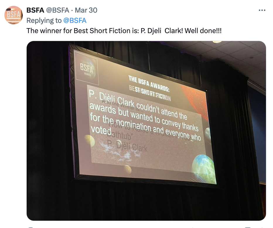 Then, to my surprise, I found out that the story was shortlisted for a British Science Fiction Association Award (BSFA). Whaaat? Completely unexpected. Then on March 29th, I get to share that the story is nominated for a Hugo Award. Whoa! What is even happening? When the story actually won the BSFA practically the next day on March 30th, I was absolutely floored.